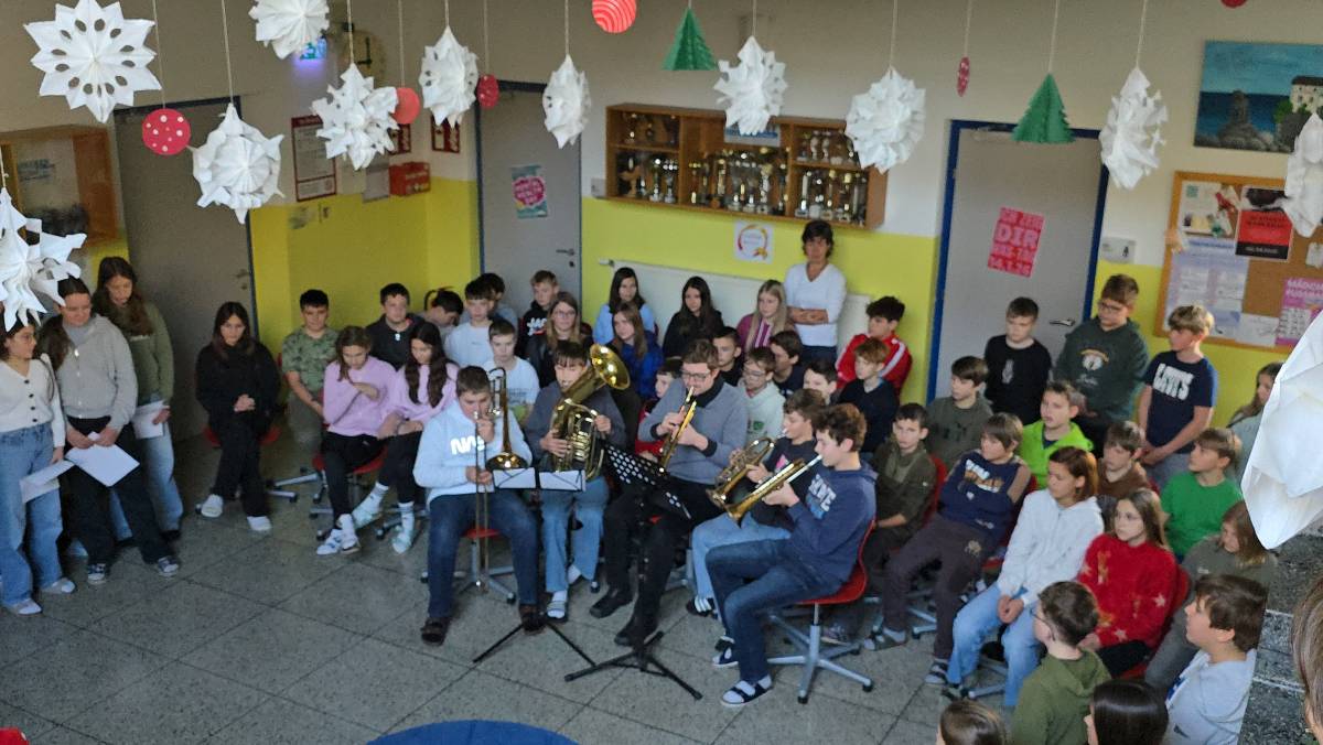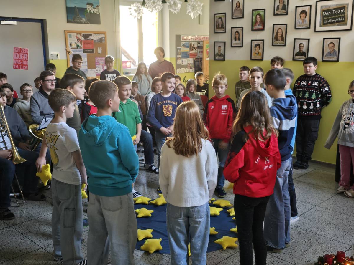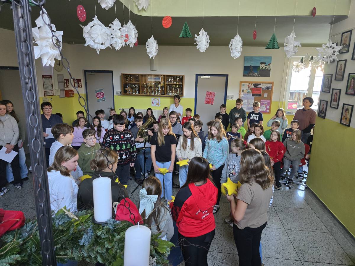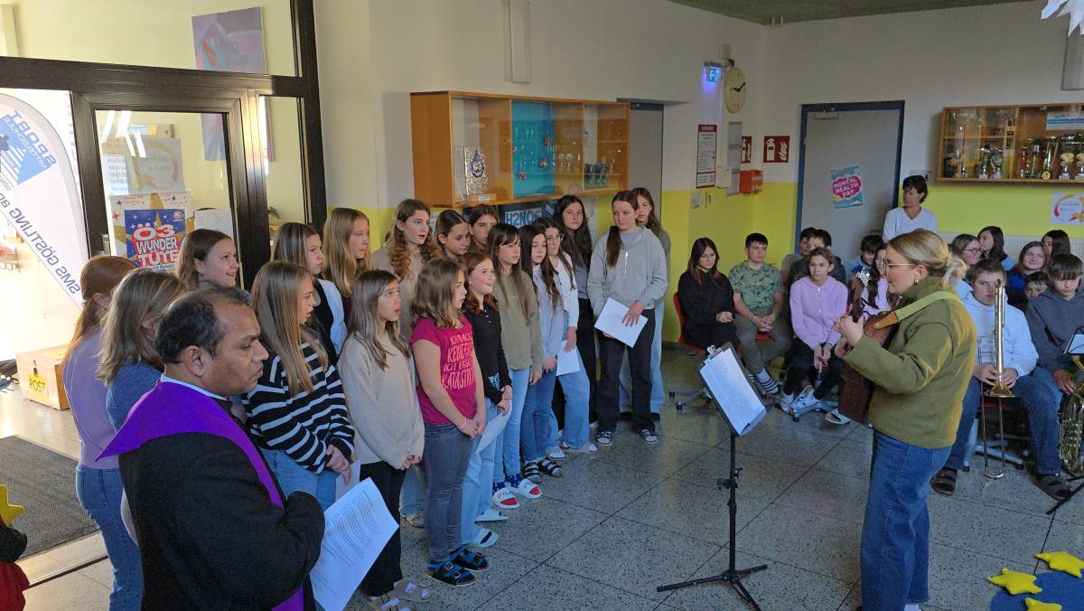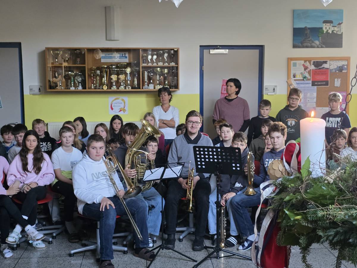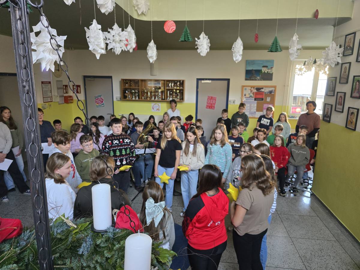 Der Schulchor sowie die Bläsergruppe sorgten mit stimmungsvollen Liedern und musikalischen Beiträgen für eine feierliche Atmosphäre. Ein besonderes Highlight boten die SchülerInnen der 1a und 1b: Sie hatten im Vorfeld Sterne genäht und trugen dazu persönliche Wünsche vor. Aus all diesen Sternen entstand schließlich ein gemeinsames, leuchtendes Sternenbild, ein sichtbares Zeichen für Gemeinschaft, Hoffnung und das Zusammenhalten in der Adventzeit.