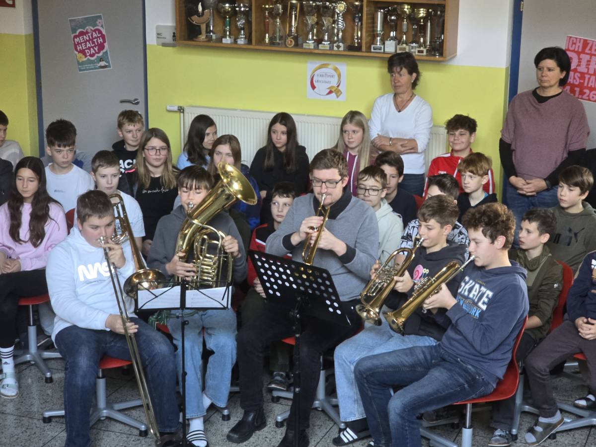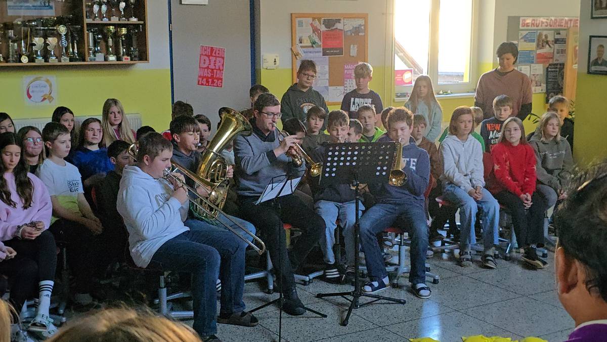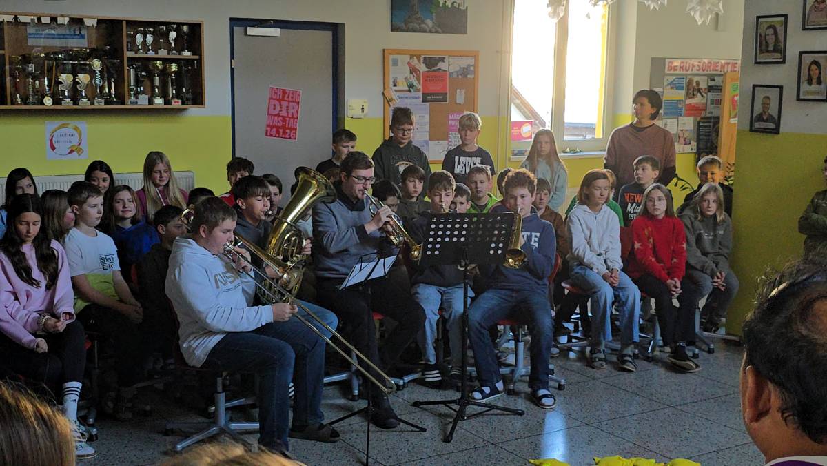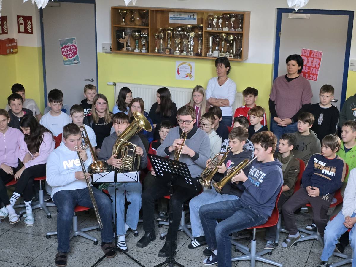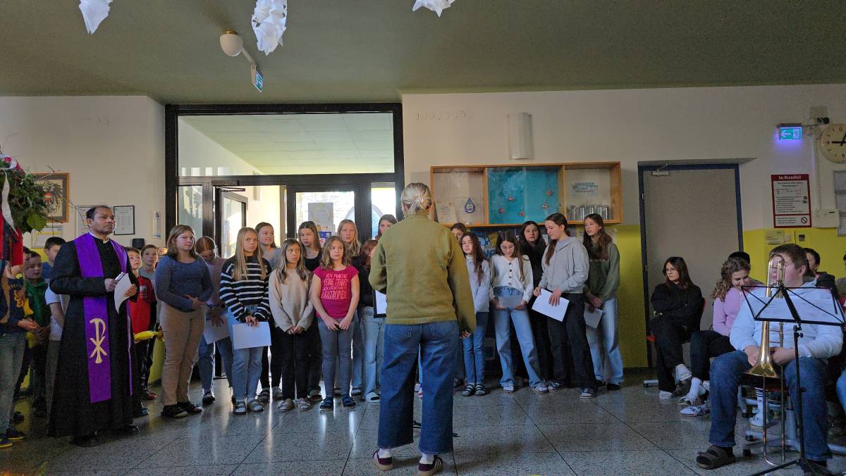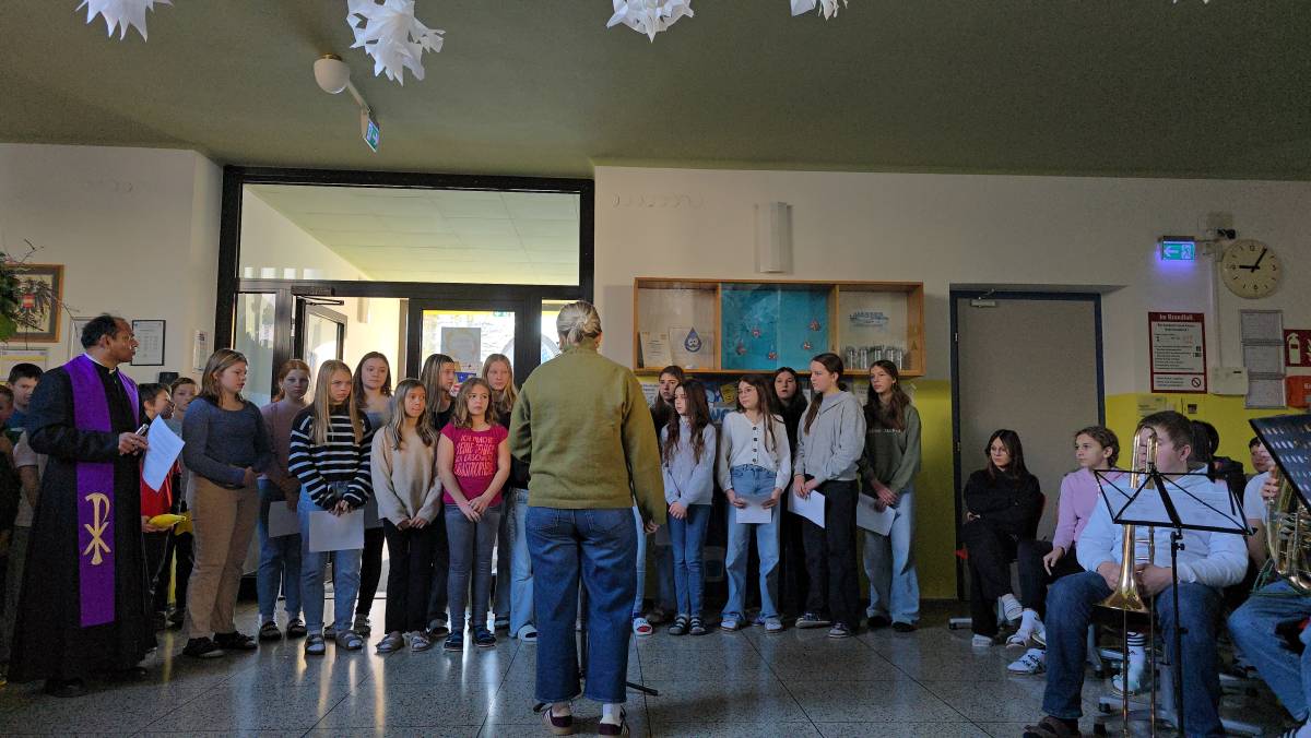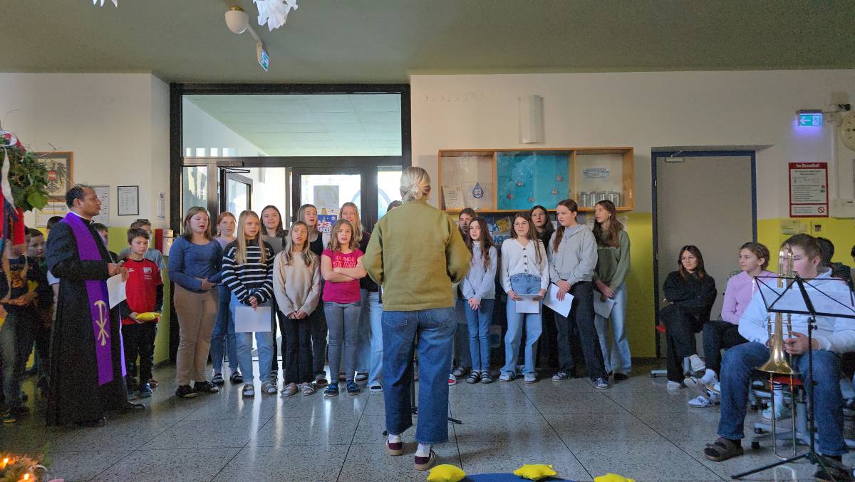 Der Schulchor sowie die Bläsergruppe sorgten mit stimmungsvollen Liedern und musikalischen Beiträgen für eine feierliche Atmosphäre. Ein besonderes Highlight boten die SchülerInnen der 1a und 1b: Sie hatten im Vorfeld Sterne genäht und trugen dazu persönliche Wünsche vor. Aus all diesen Sternen entstand schließlich ein gemeinsames, leuchtendes Sternenbild, ein sichtbares Zeichen für Gemeinschaft, Hoffnung und das Zusammenhalten in der Adventzeit.