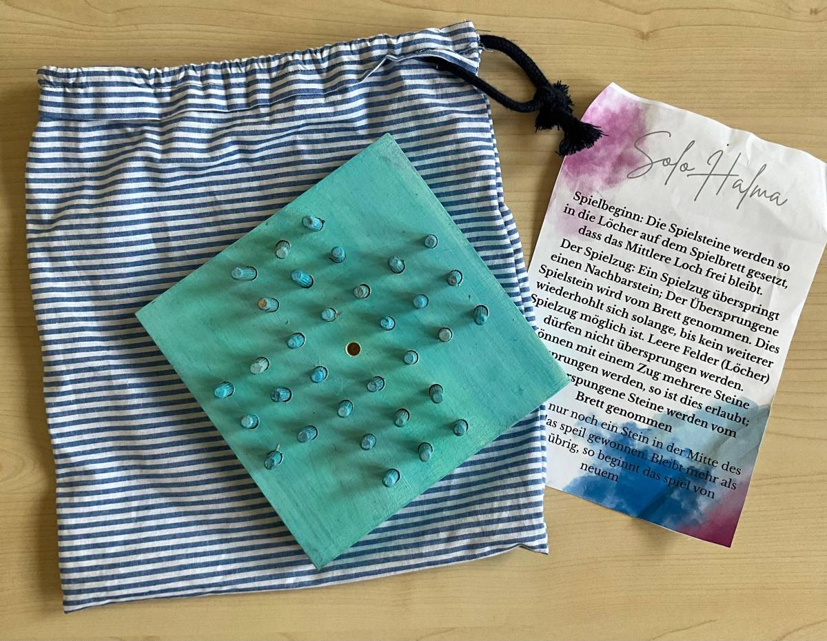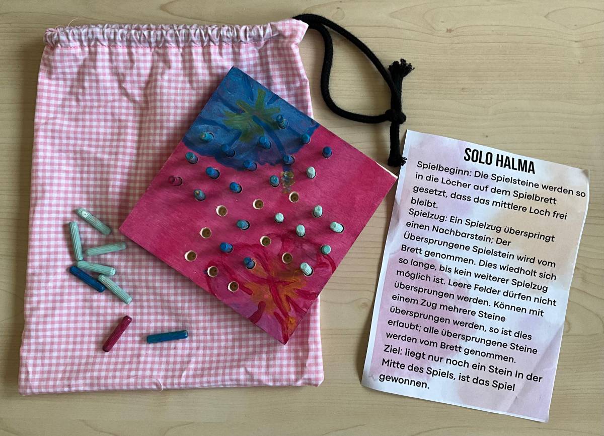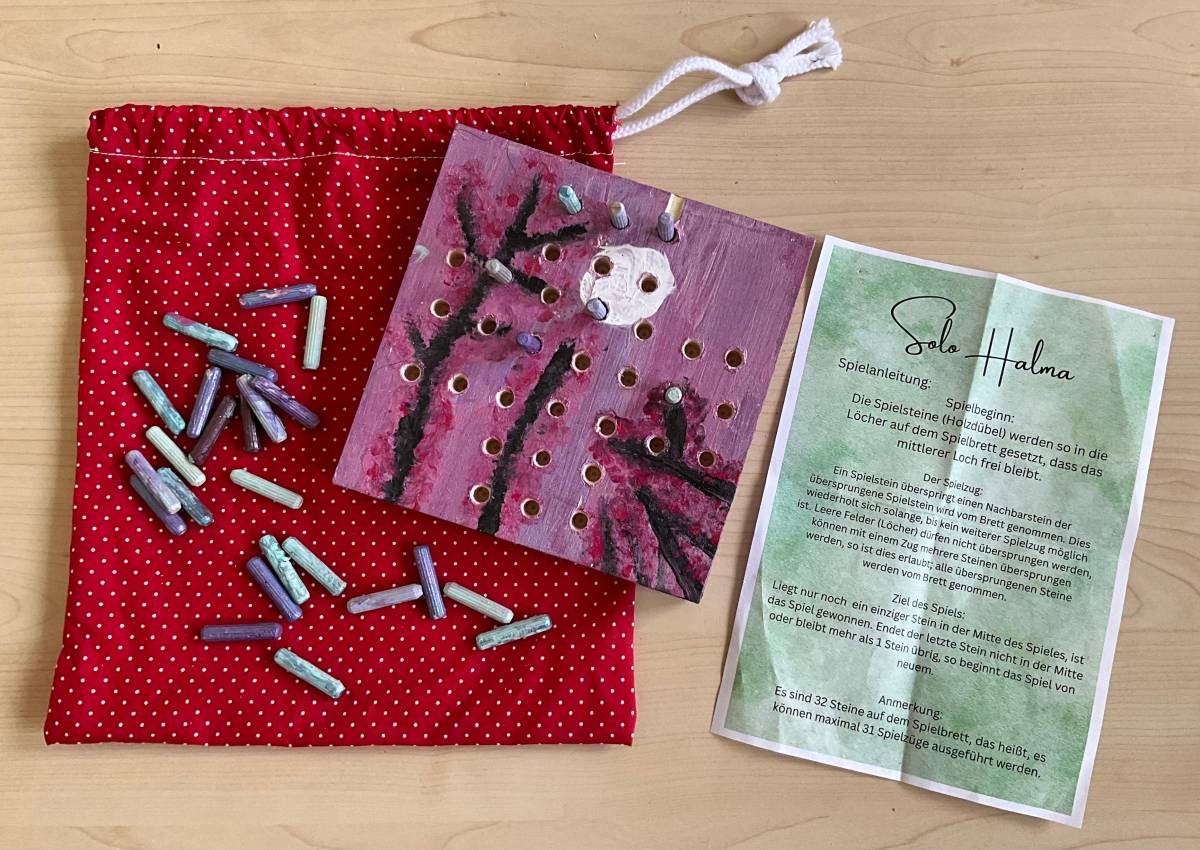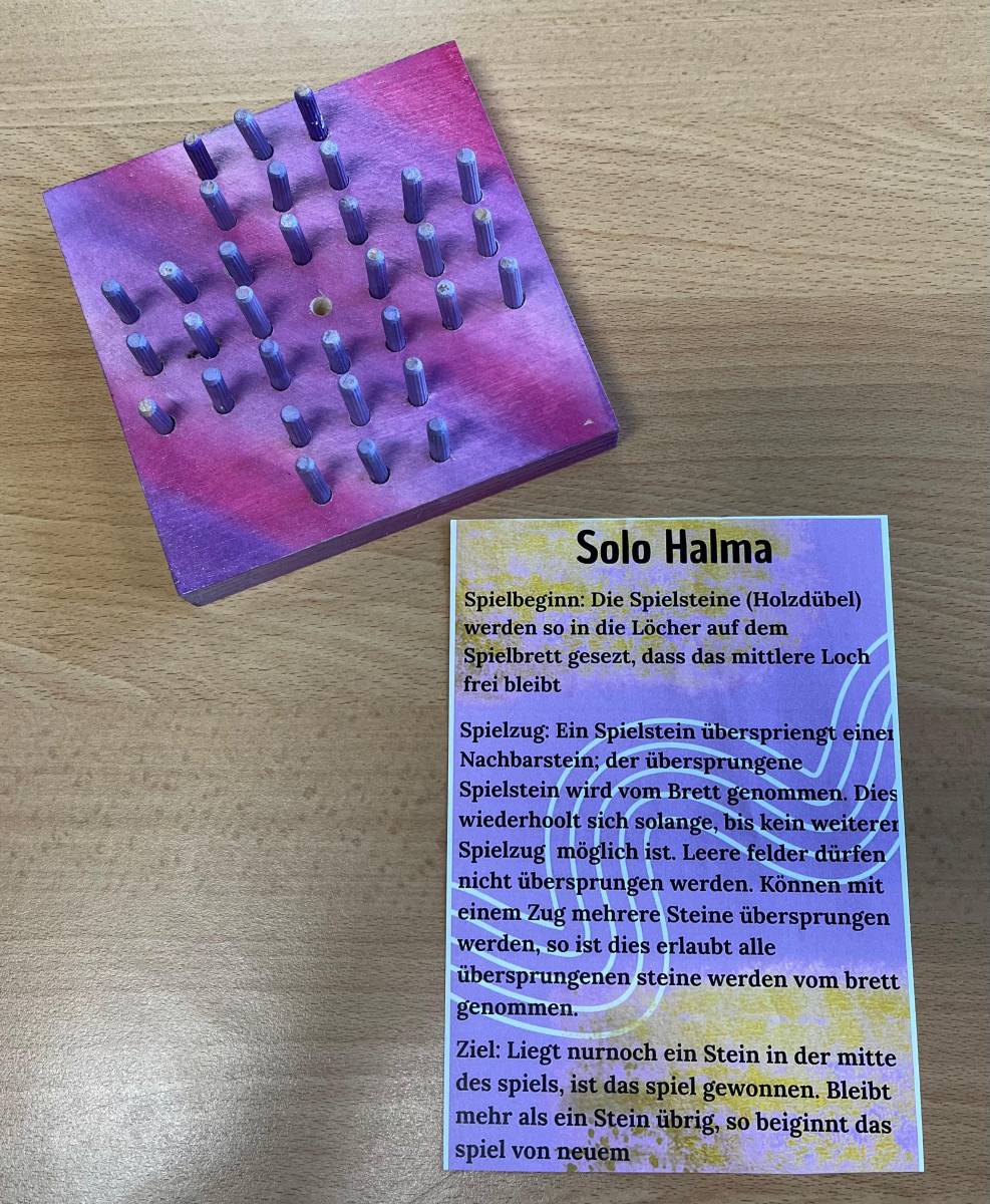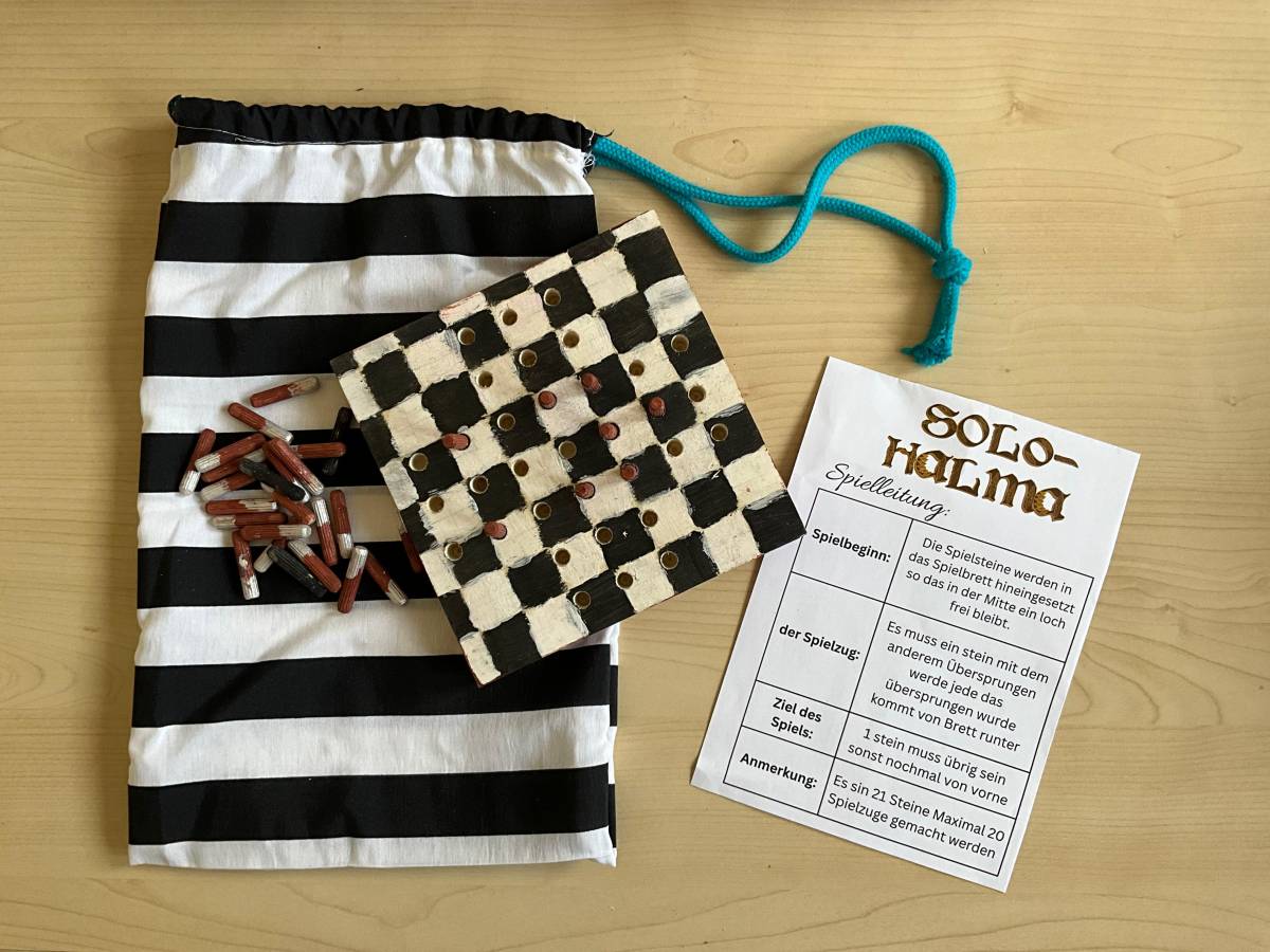 Als praktisches Ergebnis ihrer Arbeit entstanden kreative Solo-Halma-Spiele aus Holz, die mit großer Genauigkeit gebohrt und gestaltet wurden. Ergänzend dazu fertigten die SchülerInnen individuelle Stoffsäckchen an, die sie selbstständig mit der Nähmaschine nähten und die nun zur Aufbewahrung der Spiele dienen.
