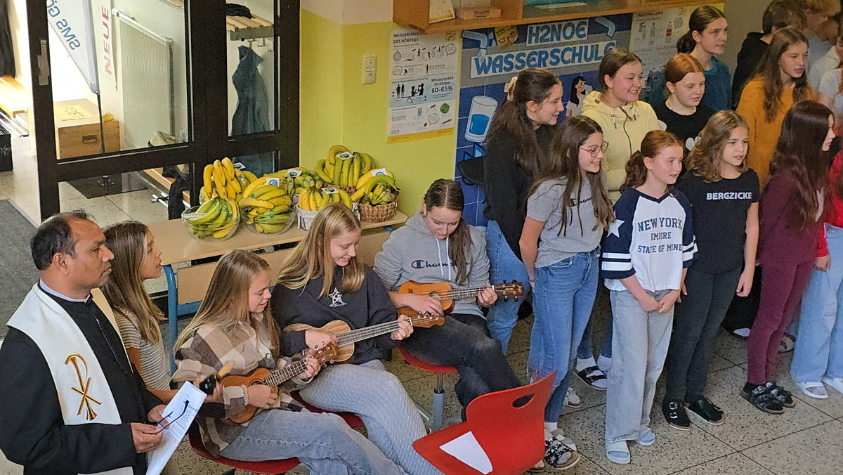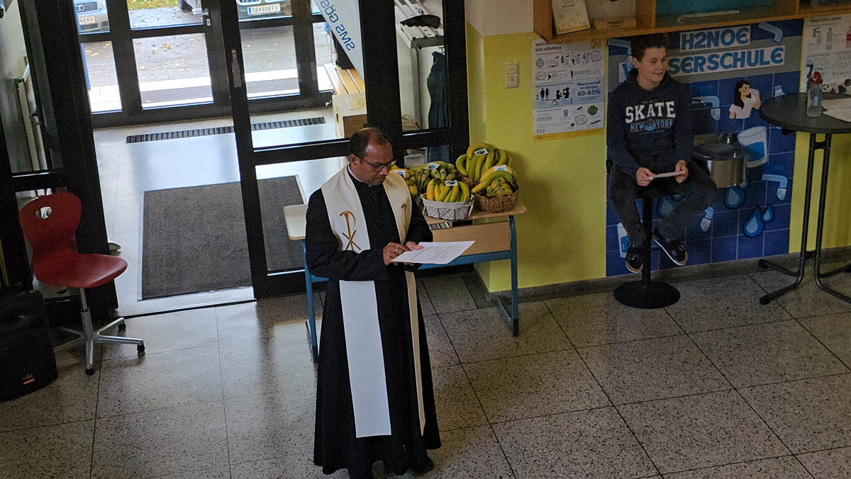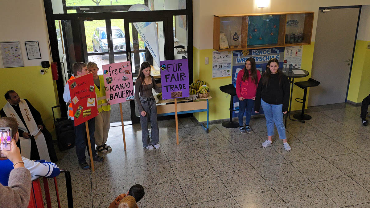 Nach den begrüßenden Worten von Frau Lehrerin Brenn eröffnete der Schulchor die Feier mit einer Darbietung des Liedes „Pata Pata“. Anschließend sprach Pater Yohanu ein Gebet für die Menschen in aller Welt und erinnerte mit seinen Worten an die Bedeutung von Gerechtigkeit und Fairness, nicht nur im globalen Handel.