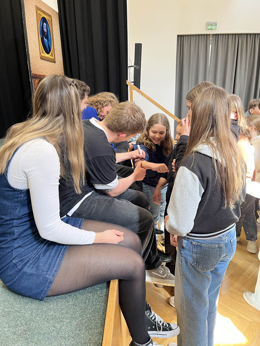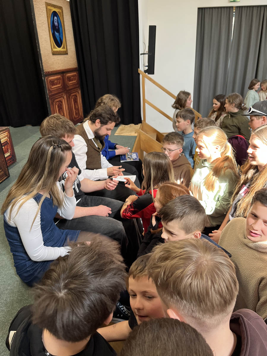 Mit viel Energie und Spielfreude begeisterten die SchauspielerInnen das junge Publikum und bezogen die SchülerInnen immer wieder aktiv in das Geschehen ein. Trotz der englischen Sprache konnten die Kinder der Handlung dank klarer Aussprache und ausdrucksstarker Darstellung sehr gut folgen und erweiterten dabei spielerisch ihren englischen Wortschatz. Die Begeisterung war groß: Viele SchülerInnen nutzten im Anschluss die Gelegenheit, mit den DarstellerInnen zu plaudern und Erinnerungsfotos zu machen.
