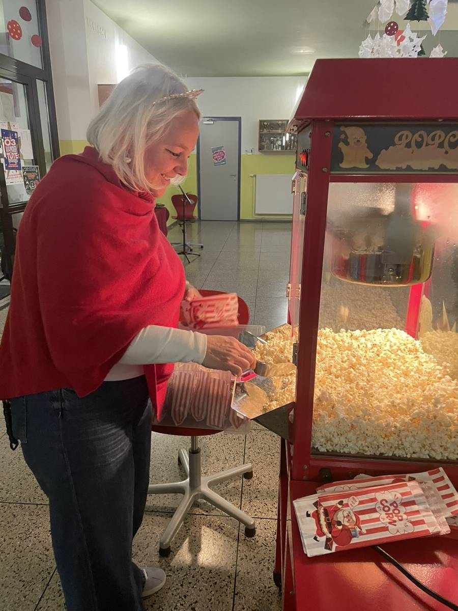 Im Anschluss hatten die Kinder die Möglichkeit, aus sechs verschiedenen Weihnachtsfilmen ihren Favoriten auszuwählen und gemeinsam anzusehen. Für das leibliche Wohl war ebenfalls bestens gesorgt: Frisch zubereitetes, hausgemachtes Popcorn aus der Popcornmaschine machte das Kinoerlebnis perfekt. Ein herzliches Dankeschön gilt unserem Herrn Direktor, der das Popcorn großzügig gespendet hat.